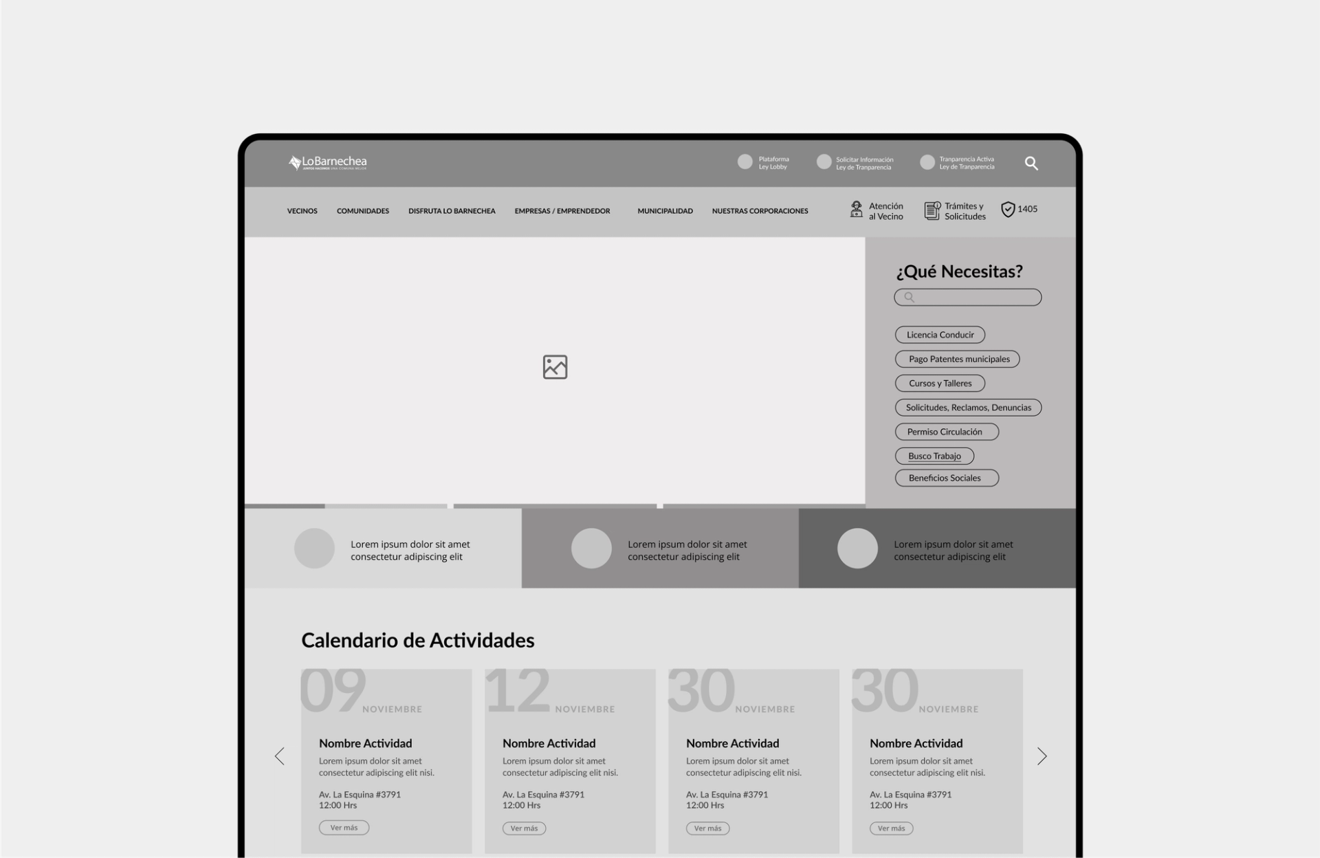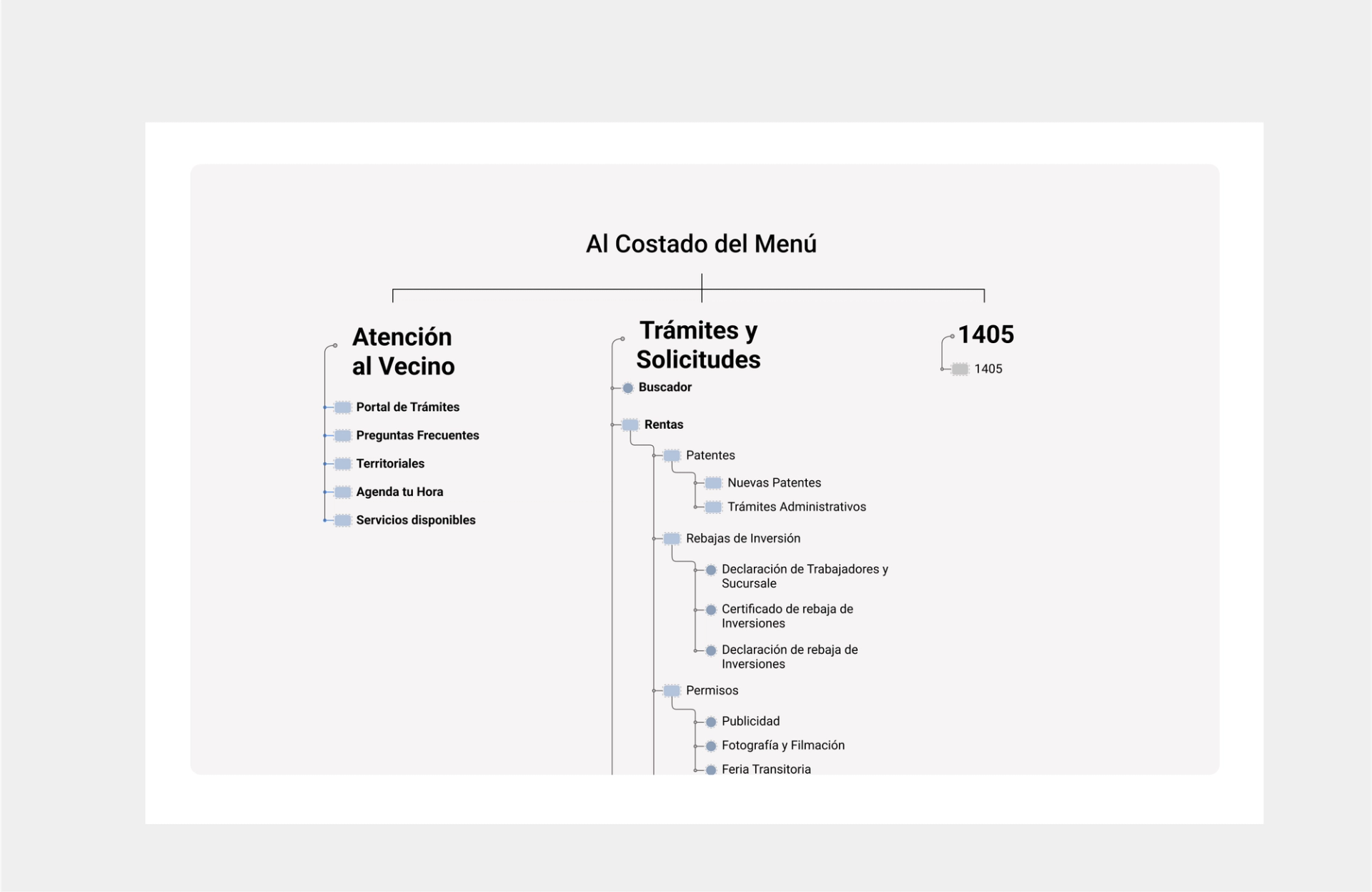 Realizamos entrevistas a los distintos departamentos de la municipalidad, ordenamos la información en base a 2 preguntas fundamentales Quien soy y que busco. En base a esto realizamos una nueva distribución de la web y una arquitectura de la información para así bajar esta información a wireframes y luego ser testeados por los usuarios para luego realizar los ajustes finales y una propuesta de colores del home.